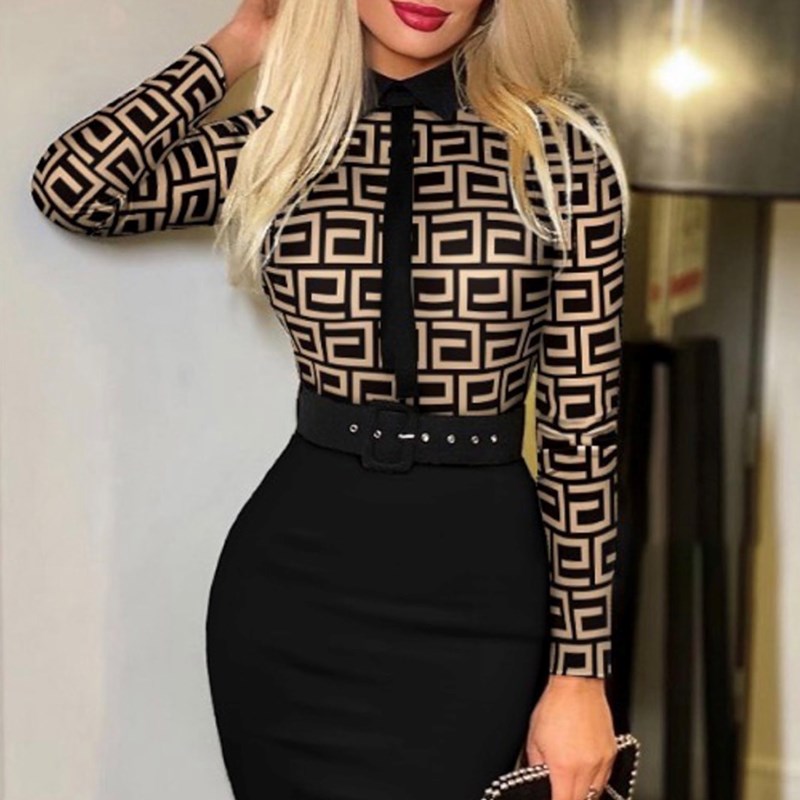 Crna elegantna haljina s geometrijskim printom i visokim ovratnikom. Elegantna midi haljina uskog kroja izrađena je od mekanog materijala visoke kvalitete koji pruža potpunu udobnost tijekom nošenja. Haljina s modernim geometrijskim printom ima visoki ovratnik i duge rukave. Dužina haljine doseže do ispod koljena. Proizvod je takođe dostupan u većim veličinama do 2XL i prikladan ženama jače tjelesne konstitucije. U ovoj ćete haljini zablistati. Sastav materijala 95% poliester i 5% elasten. Veličine: S = 36 M = 38 L = 40 XL = 42 2XL = 44.