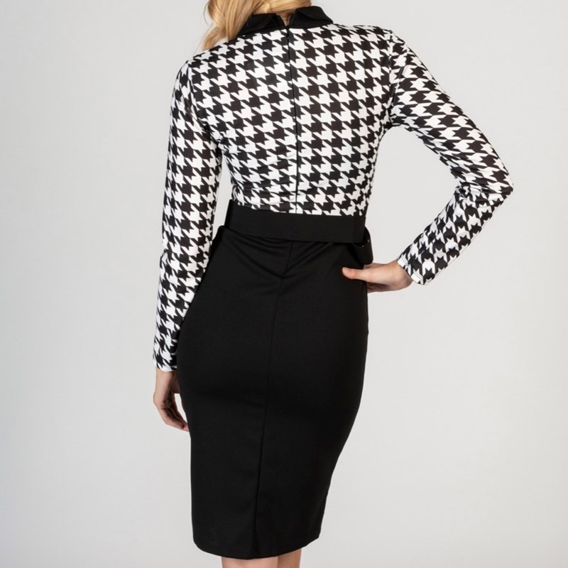 Bijela elegantna haljina s geometrijskim printom i visokim ovratnikom. Elegantna midi haljina uskog kroja izrađena je od mekanog materijala visoke kvalitete koji pruža potpunu udobnost tijekom nošenja. Haljina s modernim geometrijskim printom ima visoki ovratnik i duge rukave. Dužina haljine doseže do ispod koljena. Proizvod je takođe dostupan u većim veličinama do 2XL i prikladan ženama jače tjelesne konstitucije. U ovoj ćete haljini zablistati. Sastav materijala 95% poliester i 5% elasten. Veličine: S = 36 M = 38 L = 40 XL = 42 2XL = 44.