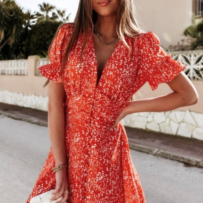 Elegantna mini haljina uskog kroja izrađena je od mekane i udobne visokokvalitetne tkanine koja osigurava potpunu udobnost prilikom nošenja. Haljina s cvjetnim uzorkom ima dubok izrez, kratke rukave ukrašene volanima i kopča se sprijeda. Prikladna je za razne prigode. Izrađena je od stopostotnog poliestera. Veličine: S=36 M=38 L=40 XL=42 * Bust=prsa, * Waist=struk, * Shoulder=ramena, * Sleeve length=dužina rukava, * Length=dužina * Tkanina nije rastezljiva. Veličine su takodje prikazane u galeriji ovog proizvoda.