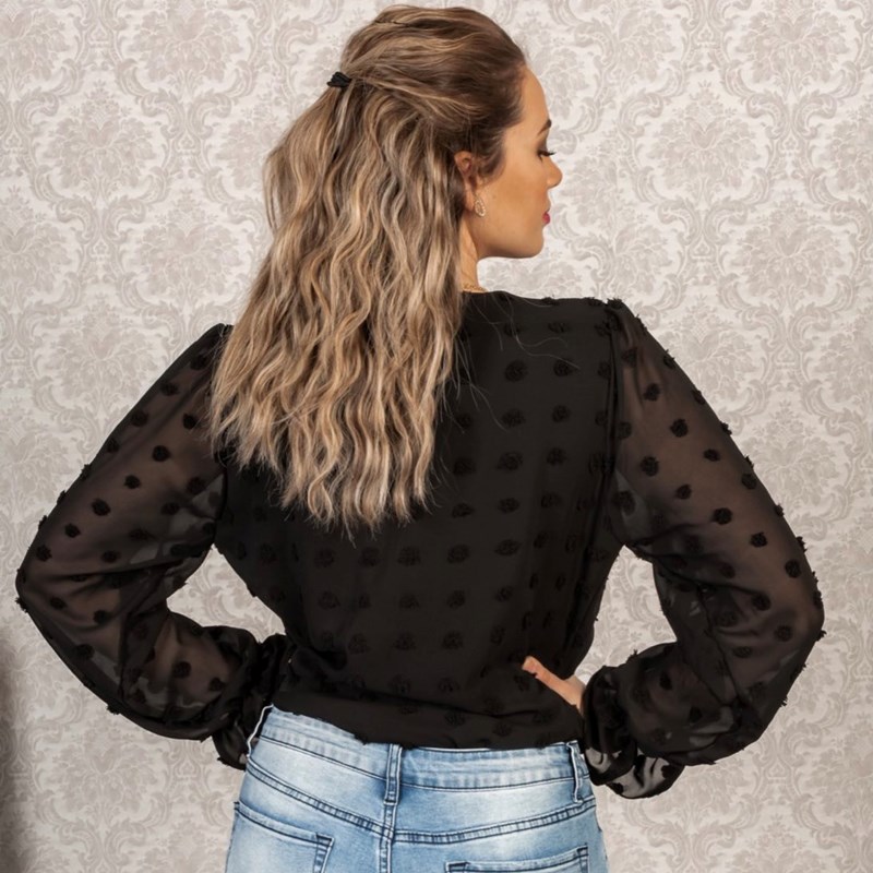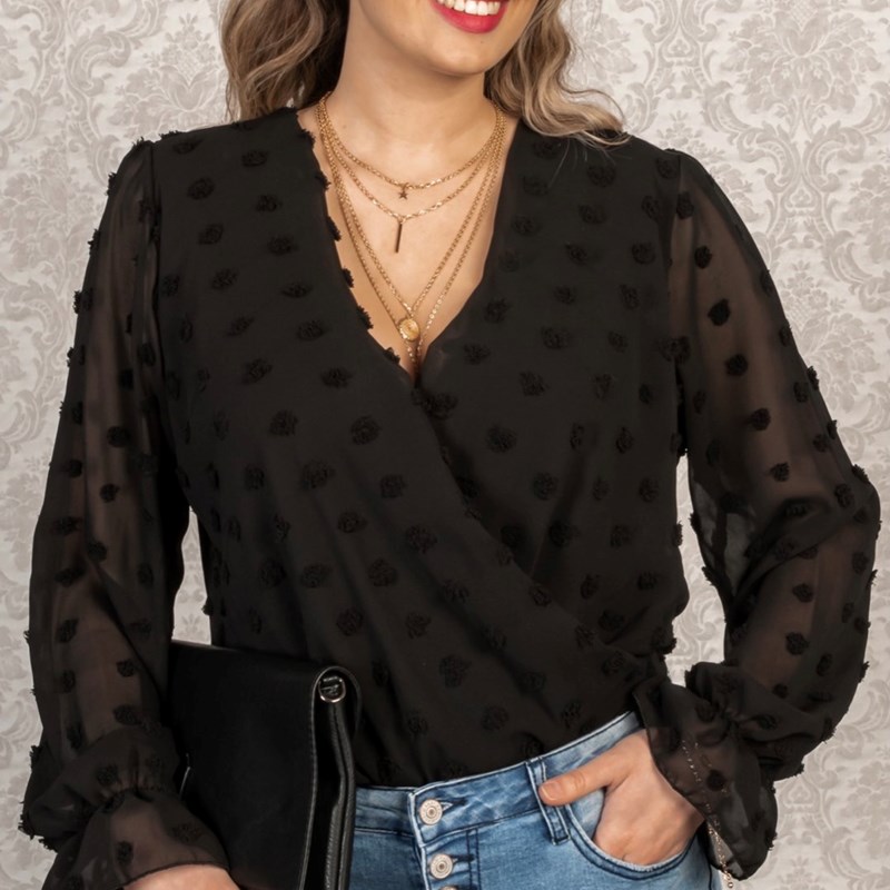 Elegantna crna široka bluza izrađena je od mekane i kompaktne tkanine visoke kvalitete koja nudi potpunu udobnost nošenja. Bluza s modnim detaljima tačkica na prednjoj strani je na preklop i ima dubok izrez. Rukavi su dugi i providni. Cijelom dužinom ima oblogu od viskoze. Predmet je takođe dostupan u većim veličinama do 3XL i prilagodjen je za jače figure. Bluza je pogodna i za elegantne i za svakodnevne modne kombinacije. Bluza je izradjena od 100% poliestera, podstava 95% viskoza i 5% elastan. Velicine: S=36 M=38 L=40 XL=42 2XL=44