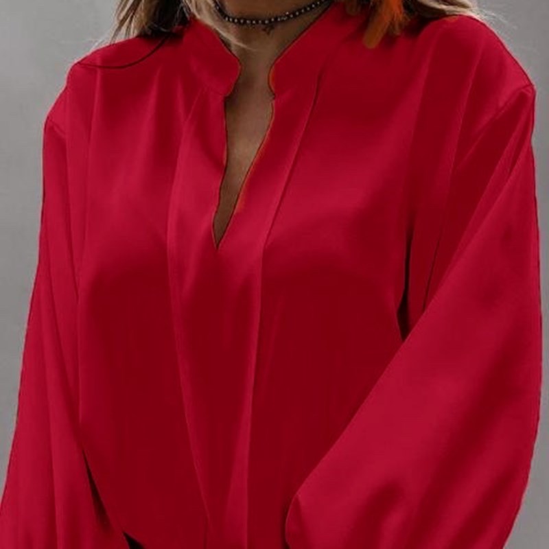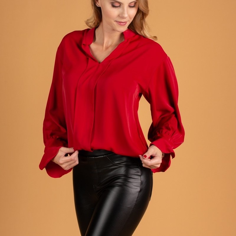 Elegantna bluza širokog kroja izrađena je od mekanog materijala visoke kvalitete koji pruža potpunu udobnost prilikom nošenja. Bluza ima visok ovratnik i dubok v-izrez. Rukavi su dugi, široki i završeni volanima. Proizvod je takođe dostupan u većim veličinama do 2XL i prikladan je ženama jače tjelesne konstitucije. Bluza je prikladna za razne modne kombinacije. Veliöine su prikazane u galeriji ovog proizvoda. Bluza je izradjena od stopostotnog poliestera.