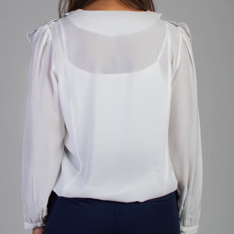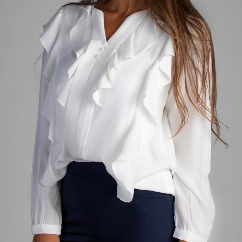 Elegantna košulja izrađena je od lagane i visokokvalitetne tkanine koja nudi potpunu udobnost kada se nosi. Košulja ima klasični ovratnik, ukrasne nabore i detalj volančića na prednjoj strani. Rukavi su dugački i kopčaju se dugmetom. Košulja je prikladna za formalne i svakodnevne prilike. Sastav materijala: 65% rajon, 35% poliester. Veličine: S=36 M=38 L=40