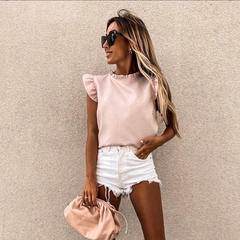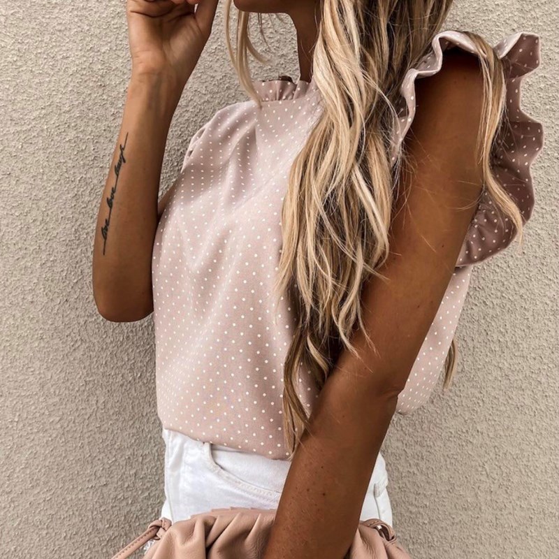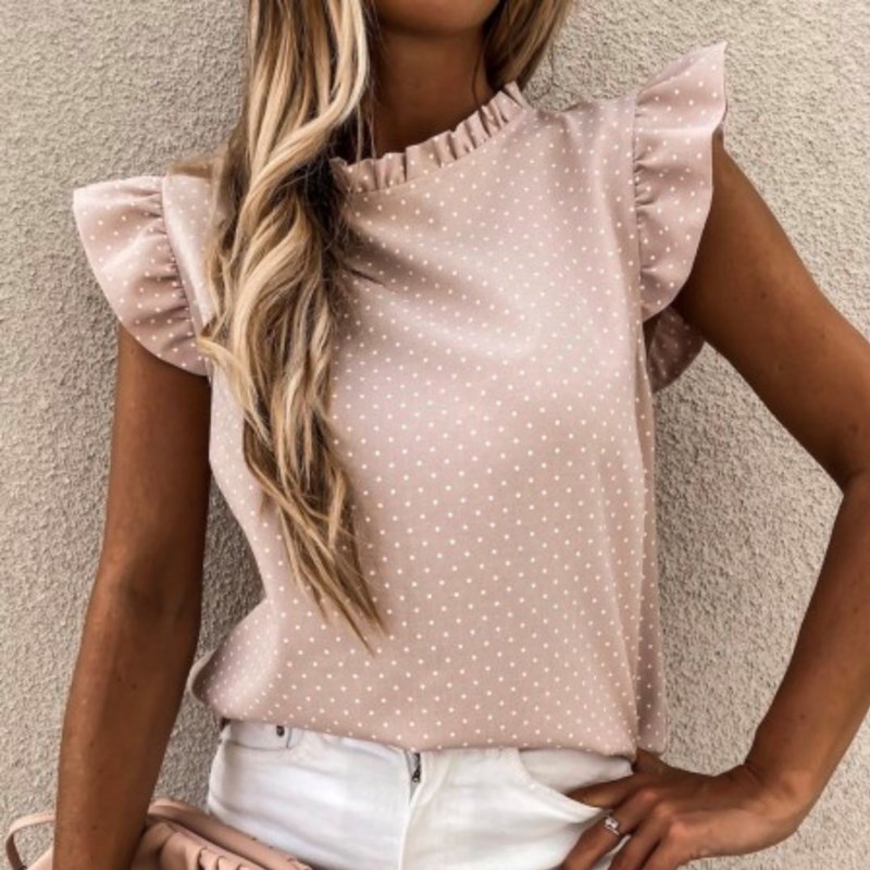 Moderna majica izrađena je od lagane, visokokvalitetne tkanine koja nudi potpunu udobnost kada se nosi. Košulja s modernim uzorkom na tačkice ima okrugli ovratnik s detaljem volančića. Također dostupna u većim veličinama do 2XL i prikladna za žene jače tjelesne konstitucije. Majica je odličan izbor za razne modne kombinacije. Sastav materijala: 95% poliester, 5% elastan. Veličine; S=36 M=38 L=40 XL=42 2XL=44