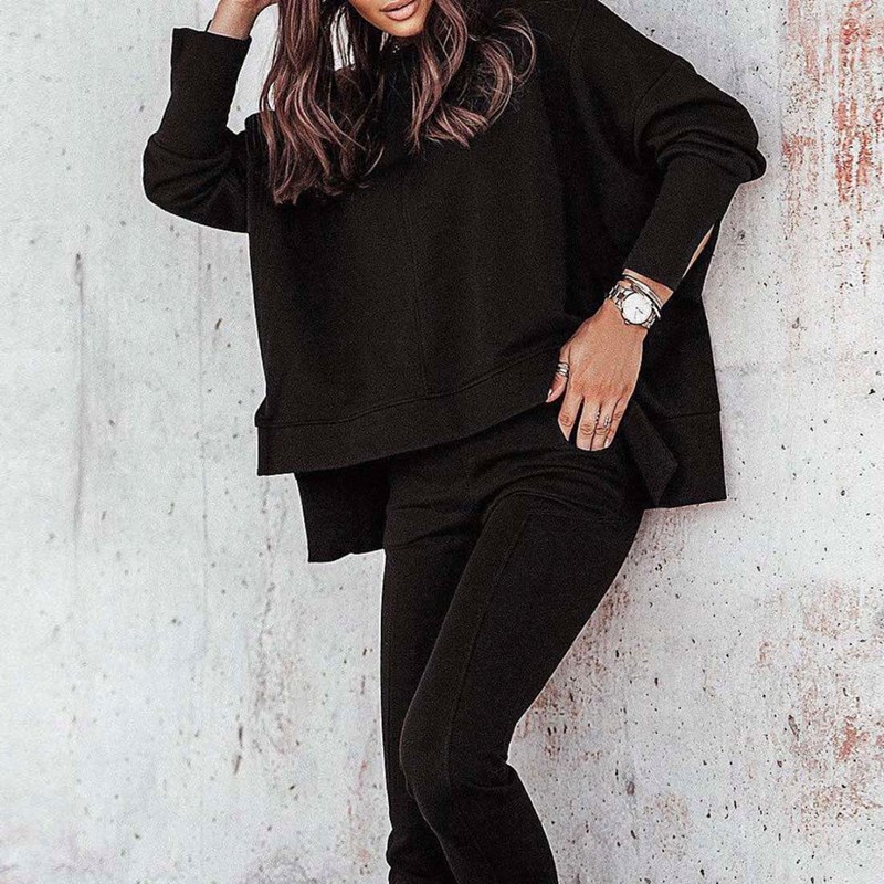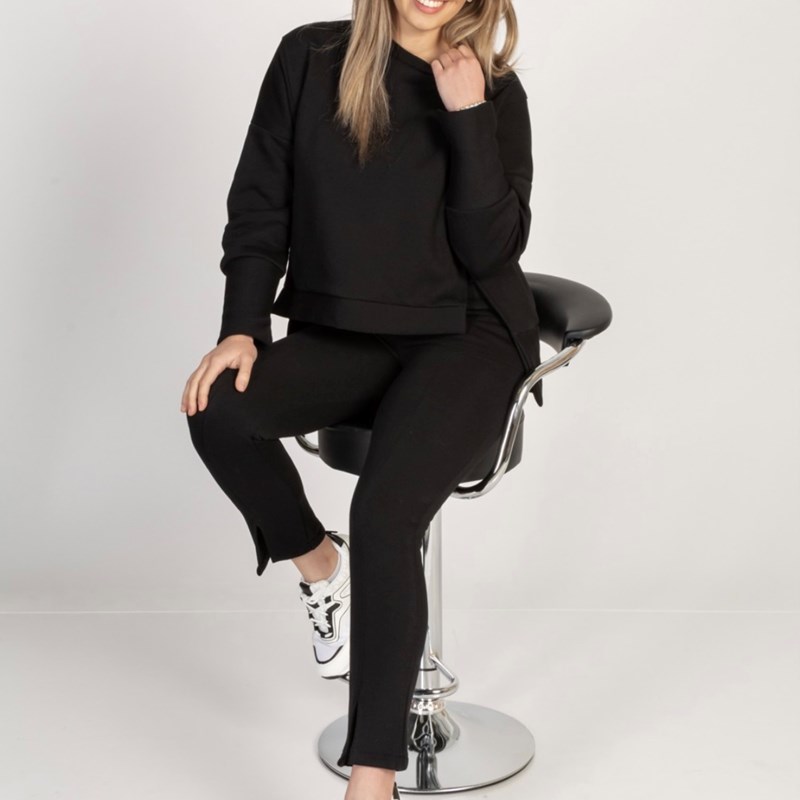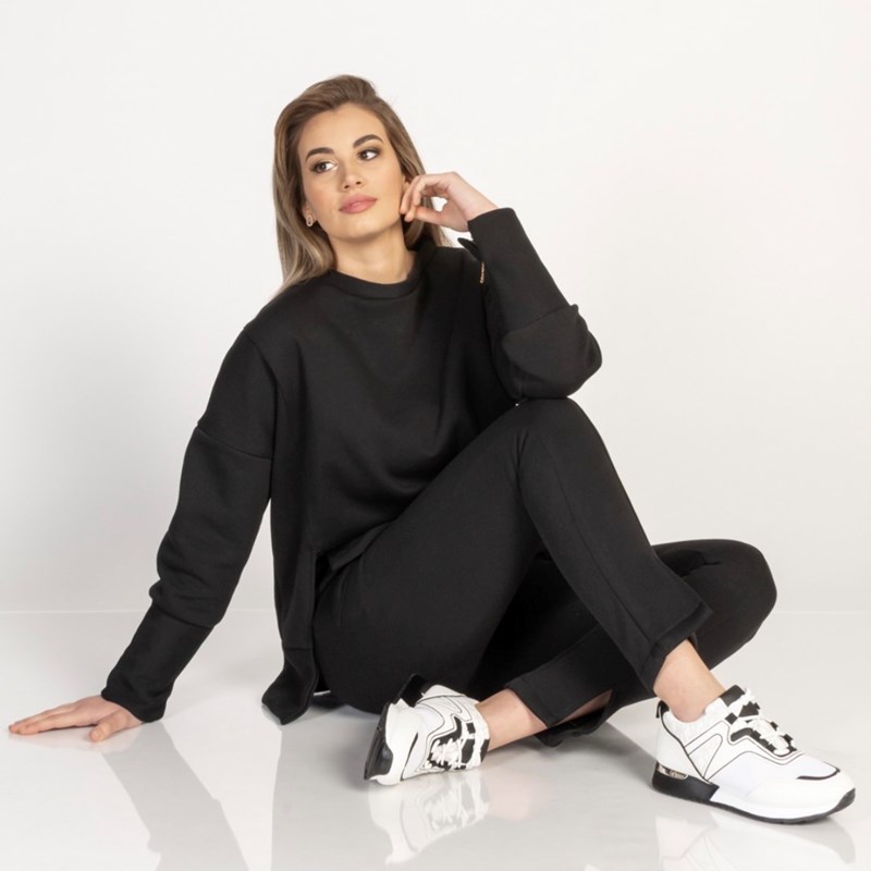 Moderna i udobna trenerka crne boje. Komplet široke majice i uskih hlača izrađen je od mekanog i rastezljivog visokokvalitetnog pamuka koji pruža potpunu udobnost tijekom nošenja. Majica ima okrugli ovratnik, duge rukave i asimetrične je dužine. Hlače su uske, imaju bočne džepove i završene su prorezom sprijeda. Proizvod je također dostupan u većim veličinama do 2XL i time dostupan ženama jače tjelesne konstitucije. Trenerka je odličan izbor za svakodnevne aktivnosti. Sastav materijala 95% pamuk i 5% elasten. Veličine: S = 36 M = 38 L = 40 XL = 42 2XL = 44.